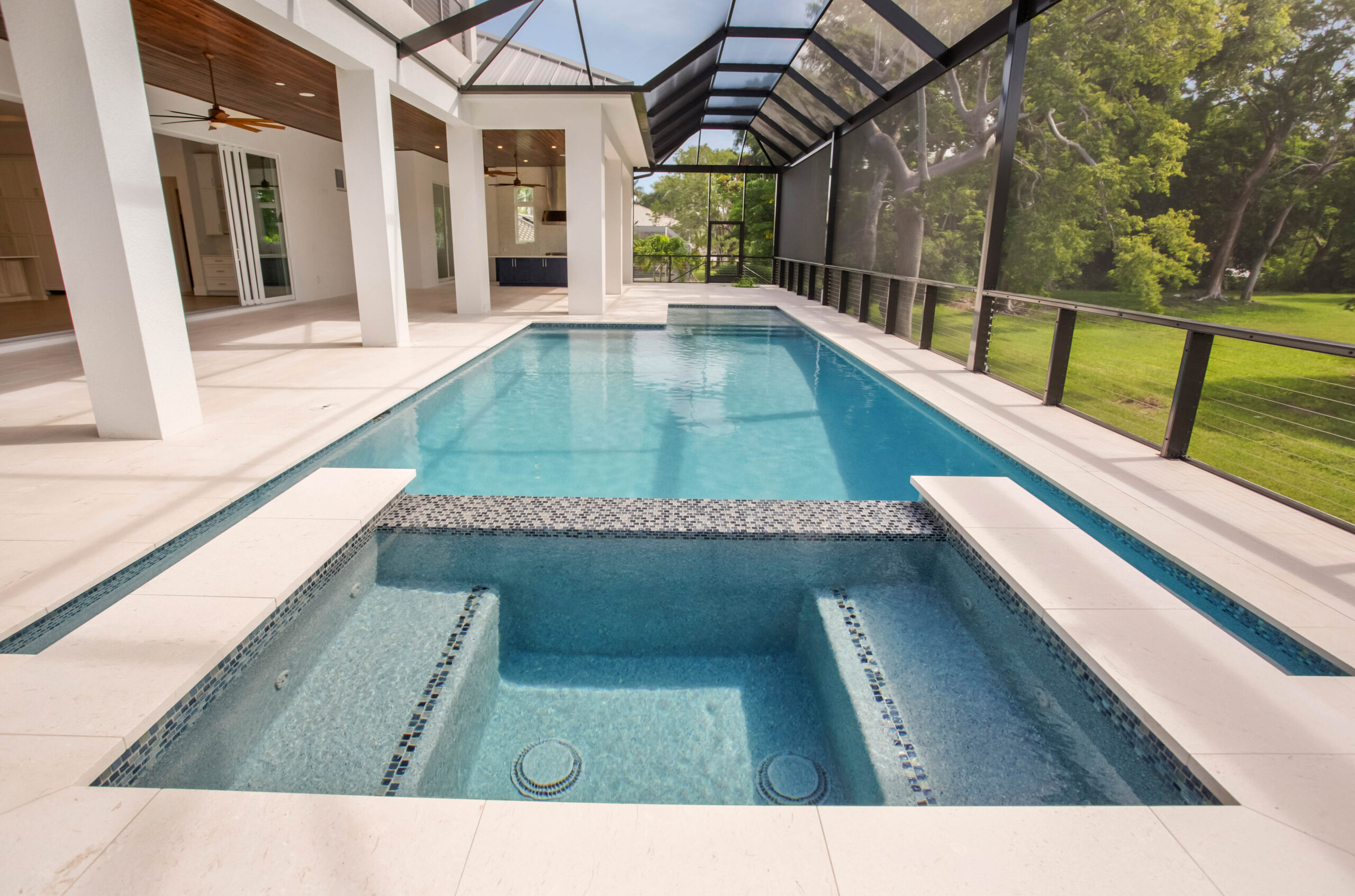 Embrace the Florida lifestyle with an exceptional outdoor living space designed for relaxation and entertainment. The saltwater pool, spa, summer kitchen, pool bath, outdoor shower and electric fireplace provide a haven for enjoyment. Covered lanais equipped with electric screens offer comfort and protection, creating a setting for alfresco dining and lounging.